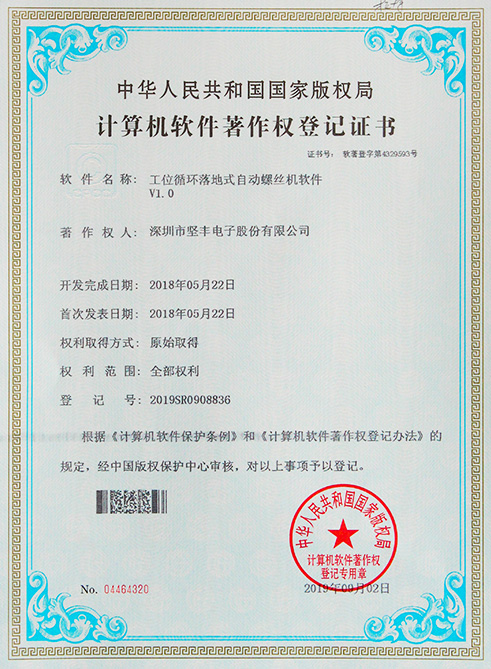 堅豐工位循環(huán)落地式自動螺絲機軟件證書